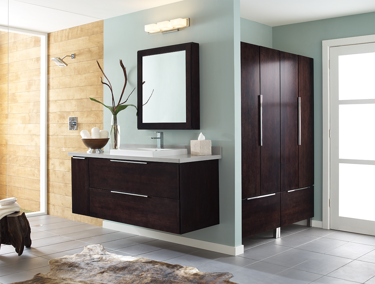 Pictured is the contemporary styled Decora® Marquis floating wall mounted cabinet in dark cherry with a teaberry finish.