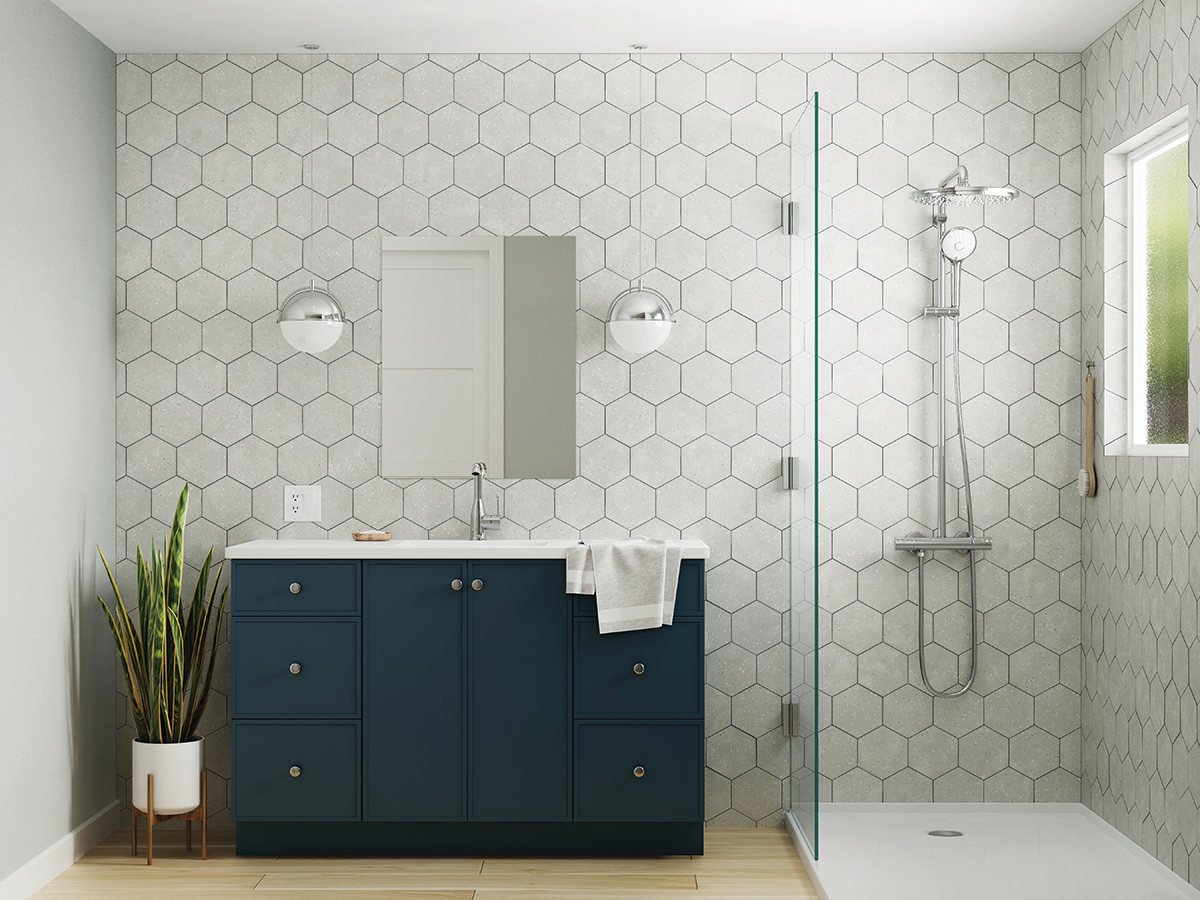 Pictured is a bath with Fieldstone® Hudson style doors in Alder wood in a Java finish.